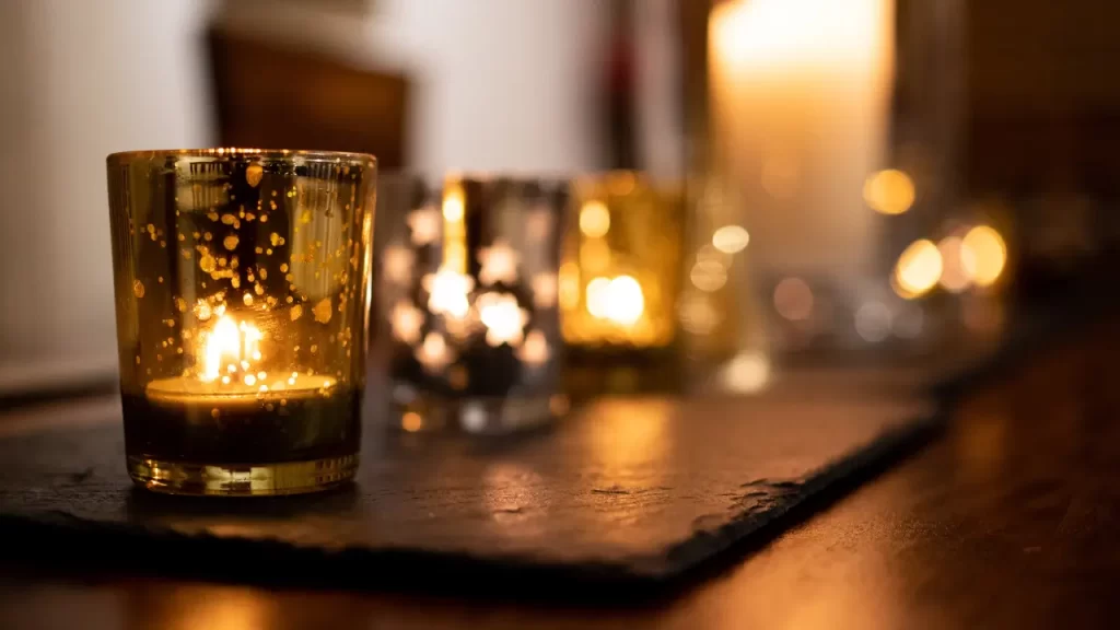 - Velas e luminárias baixas ajudam a criar um clima íntimo e convidativo, sem prejudicar a visibilidade.